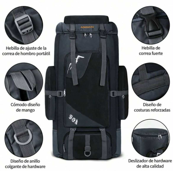 Características: 5 compartimentos con cierre de diferentes tamaños, 2 de malla, Correas extensibles y acolchonadas, resistente al agua .